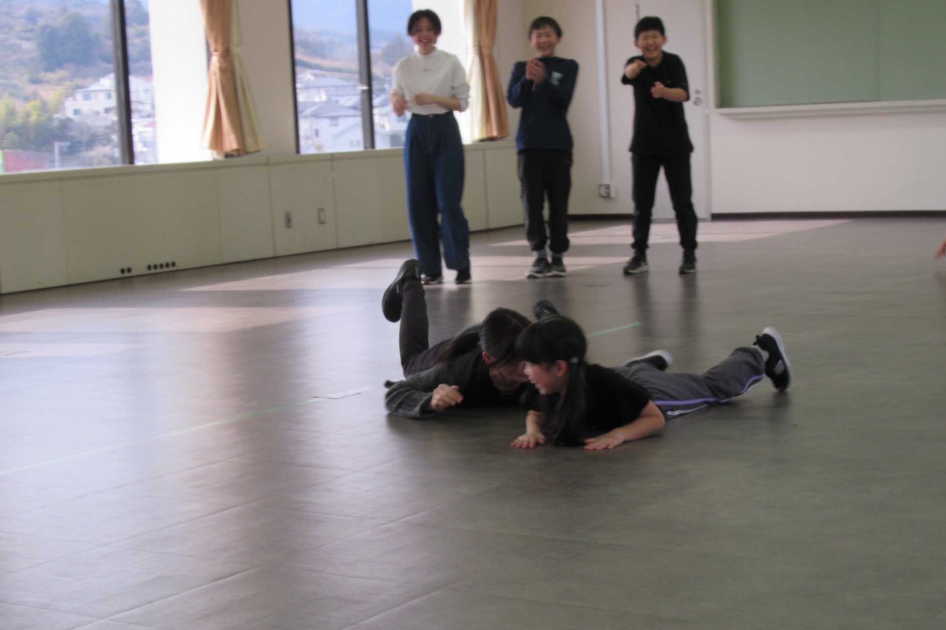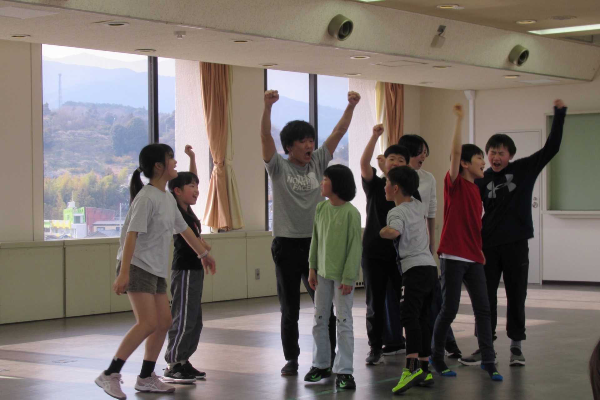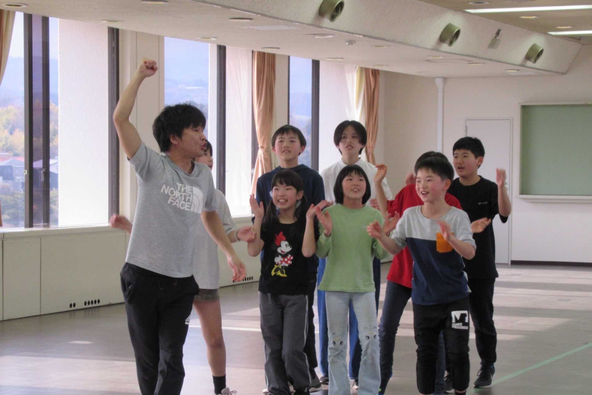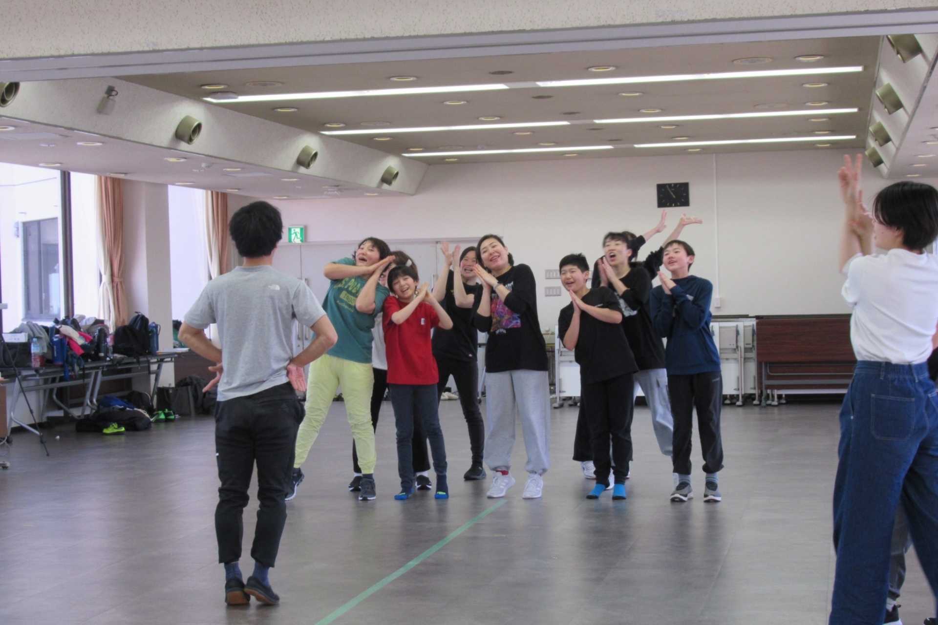 続いては、3人1組で行う「チーズバーガーゲーム」。ルールは、3人組でじゃんけんをし「グー=ハンバーグ」「チョキ=チーズ」「パー=バンズ」と役を決め、3人別々の手が揃えば「チーズバーガー」が1つ完成となり、制限時間内にどれだけ多くのチーズバーガーを作れるかというゲームです。参加者同士の距離も縮まり、稽古場に活気が生まれました。