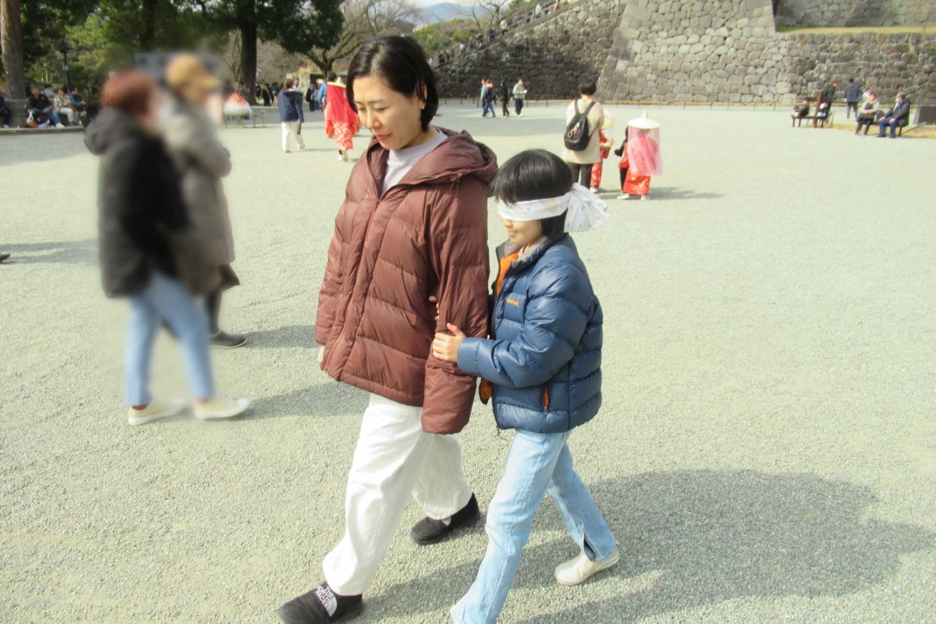 一人が目隠しをし、もう一人のガイドにより三の丸ホール周辺を歩きます。