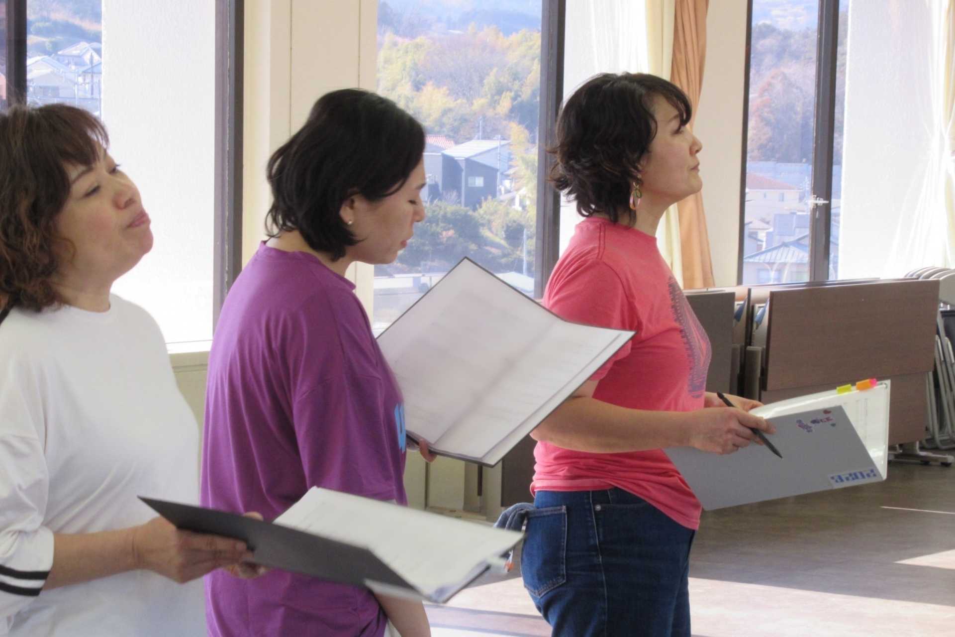 休憩を挟んで後半は、さらに各シーンの歌唱表現を深めていきました。シーンによって歌唱をしない人は、振付助手の林田海里さんによるダンスの練習を行いました。