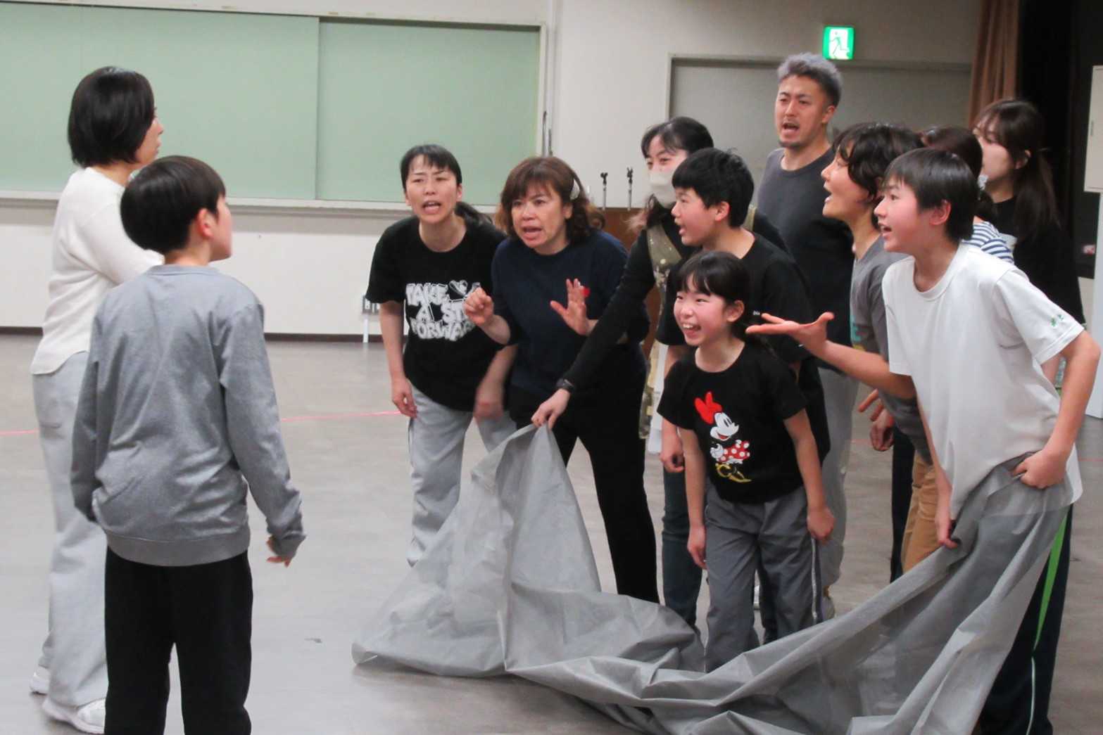 演出家の川口智子さんを中心に子どものデモのシーンの稽古をし、一方では、振付の木原浩太さんを中心に会議シーンの確認をしたりと、一分一秒たりとも無駄にはできません!