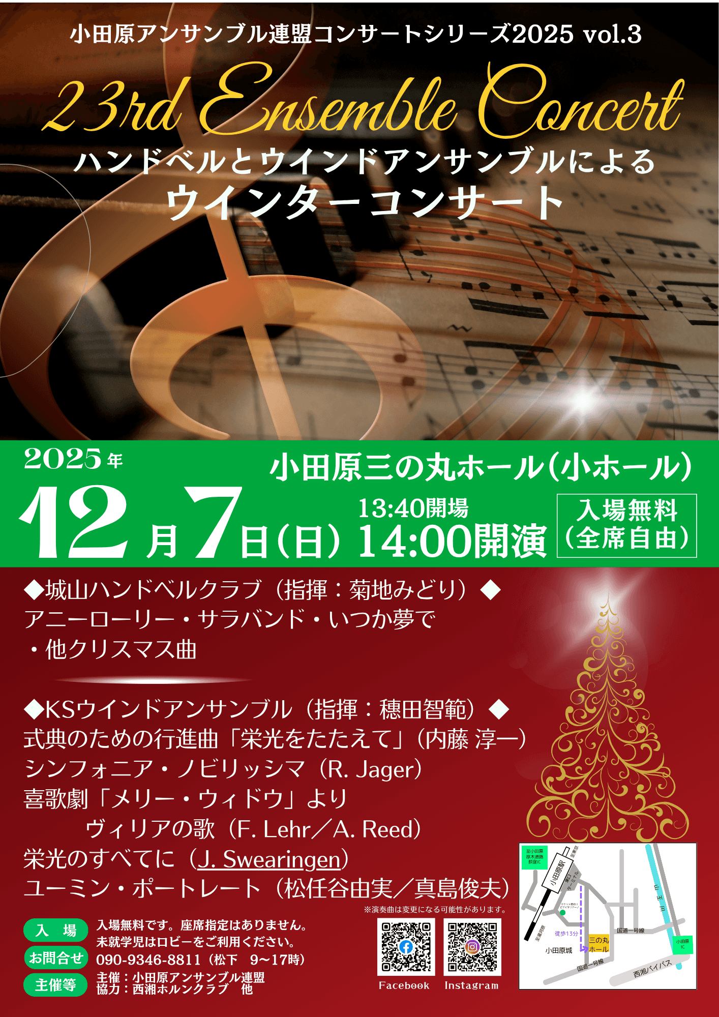 | 主催 / 問い合わせ先 | 小田原アンサンブル連盟 TEL:090-9346-8811(松下) Mail:sinfoniettashonan@gmail.com SNS:Instagram @sinfoniettashonan Facebook @Kswa(神奈川西湘ウインズアソシエーション) |