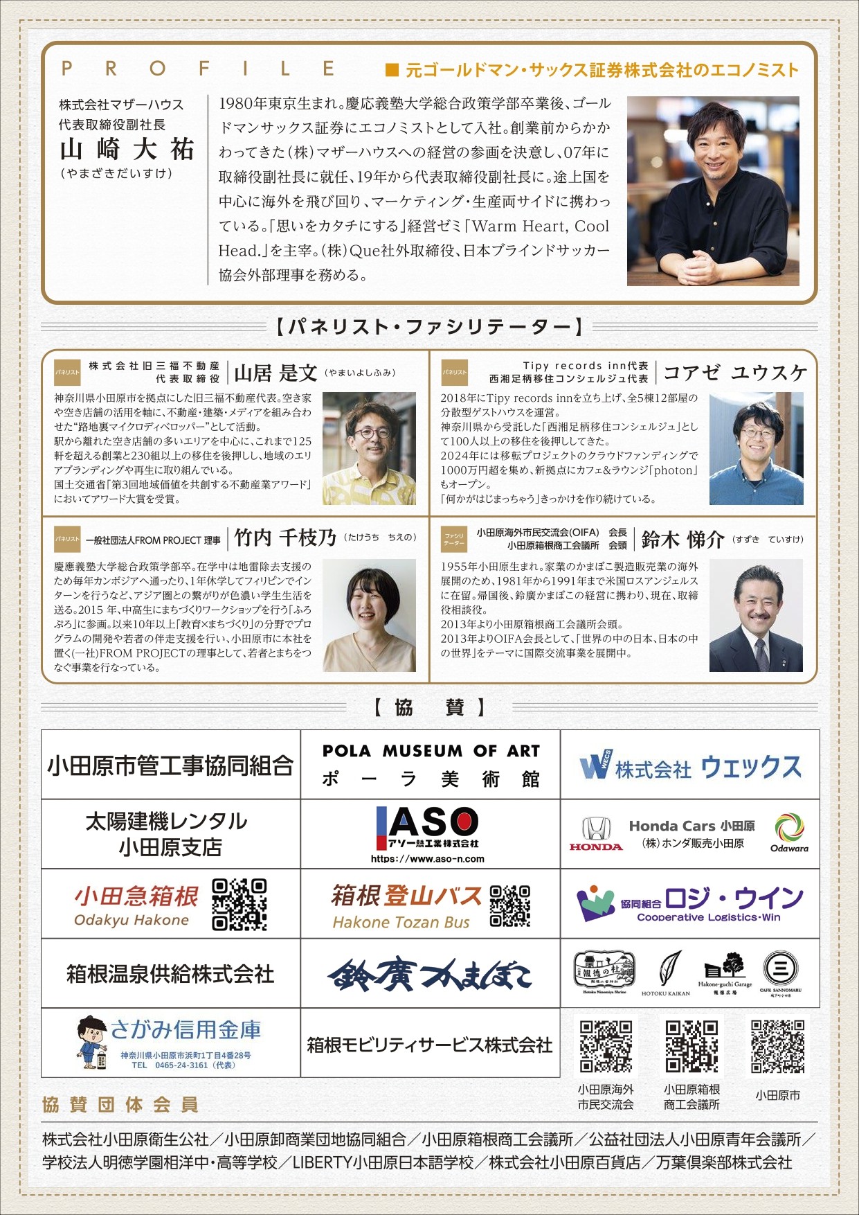 | 出演 | 株式会社マザーハウス 代表取締役副社長 山崎 大祐氏、株式会社旧三福不動産 代表取締役 山居 是文氏、Tipy records inn代表 西湘足柄移住コンシェルジュ代表 コアゼ ユウスケ氏、一般社団法人FROM PROJECT 理事 竹内 千枝乃氏、小田原市民交流会 会長 鈴木 悌介氏(小田原箱根商工会議所 会頭) |