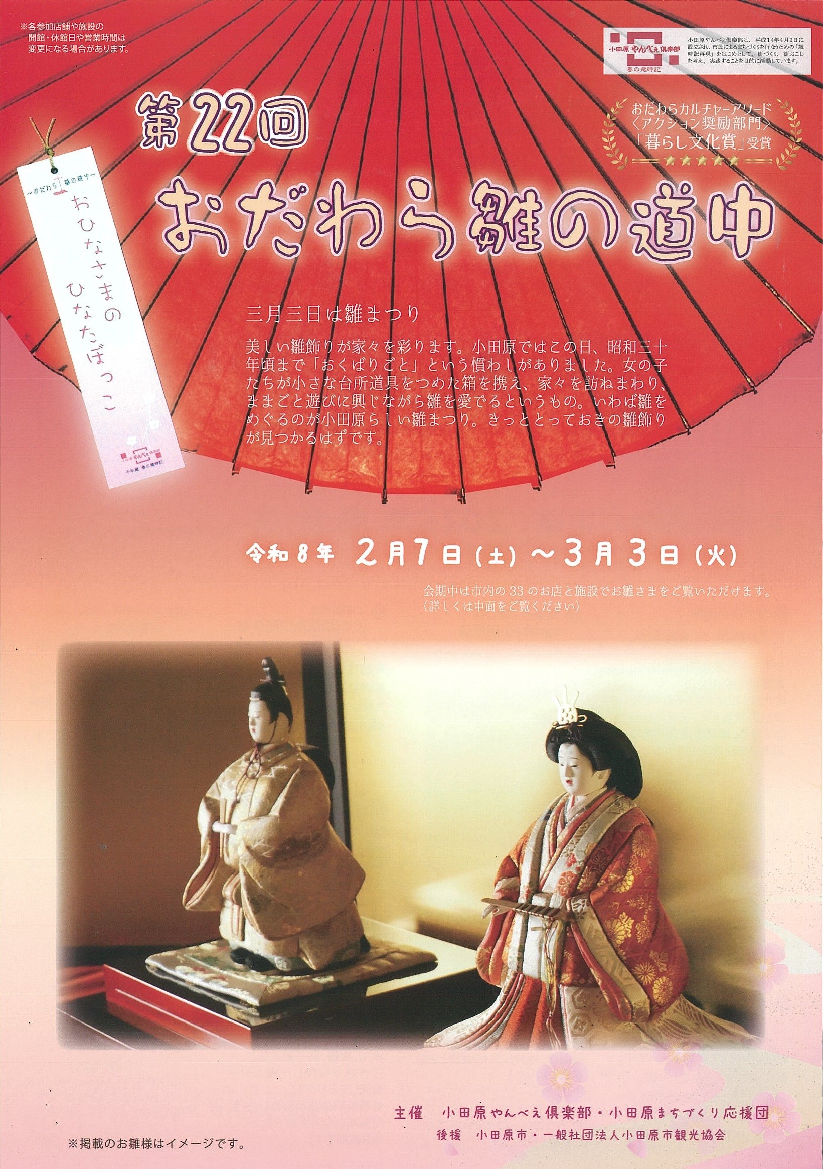| イベント概要 | 三月三日は雛まつり 美しい雛飾りが家々を彩ります。小田原ではこの日、昭和三十年頃まで「おくばりごと」と言う慣わしがありました。女の子たちが小さな台所道具を詰めた箱を携え、家々を訪ねまわり、ままごと遊びに興じながら、雛を愛でると言うもの。いわば雛をめぐるのが小田原らしい雛まつり。きっととっておきの雛飾りが見つかるはずです。 ■会期中は小田原市内の36のお店と施設でお雛様をご覧いただけるほか、多彩なイベントを開催。 ■小田原三の丸ホールの<スタンプラリー>押印は、1階受付までお越しください。 |