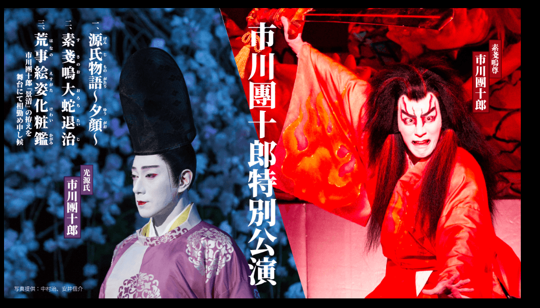 | 演目 | 一、『源氏物語 ~夕顔〜』(げんじものがたりゆうがお) 二、『素戔嗚大蛇退治』(すさのおおろちたいじ) 三、『荒事絵姿化粧鑑』(はなのえすがたけわいかがみ) 市川團十郎『景清』の拵えを舞台にて相勤め申し候 |