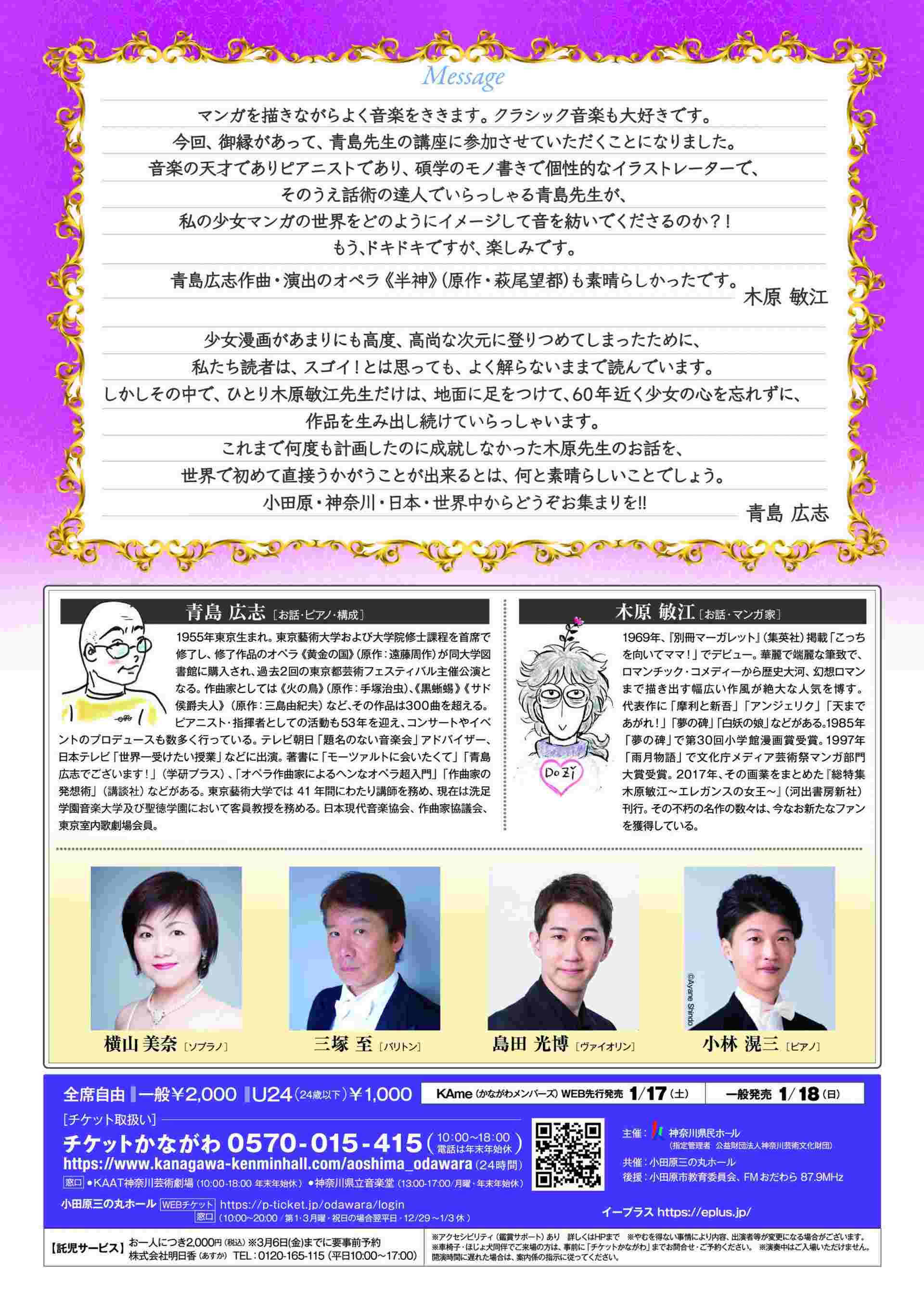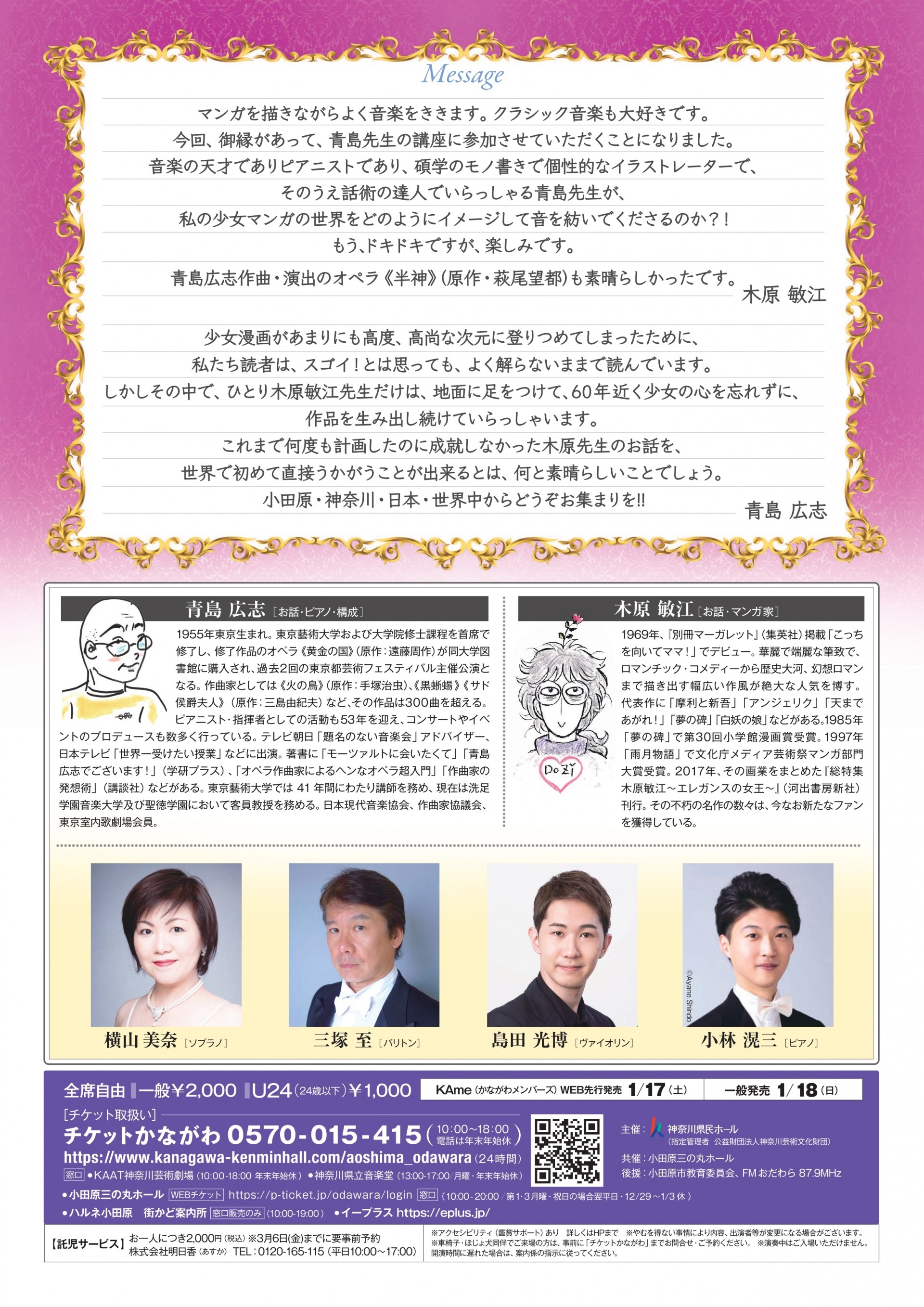 | 出演 | 木原 敏江(お話・マンガ家)、青島 広志(お話・ピアノ・構成)、横山 美奈(ソプラノ)、三塚 至(バリトン)、島田 光博(ヴァイオリン)、小林 滉三(ピアノ) |