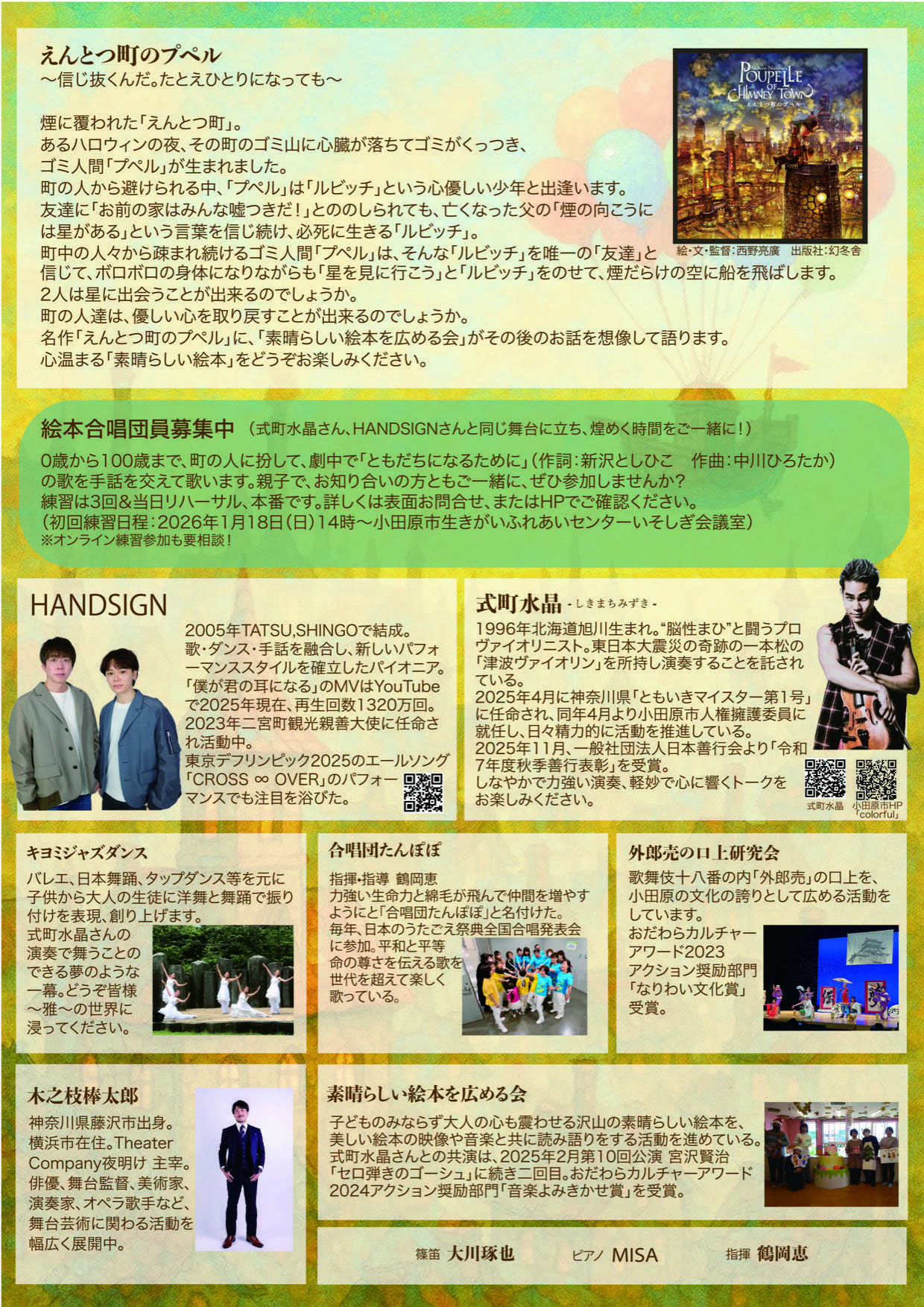 | 出演 | 式町水晶 HANDSIGN キヨミジャズダンス 外郎売の口上研究会 MISA(ピアノ) 素晴らしい絵本を広める会