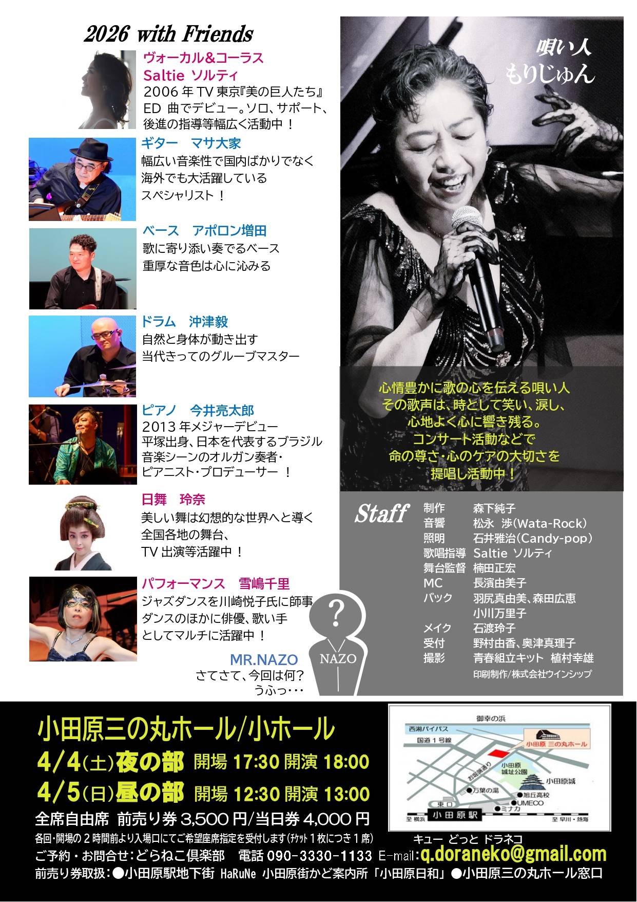 | スタッフ | 制作:森下純子 音響:松永 渉(Wata-Rock) 照明:石井雅治(Candy-pop) 歌唱指導:Saltie ソルティ 舞台監督:楠田正宏 MC:長濱由美子 バック:羽尻真由美、森田広恵、小川万里子 メイク:石渡玲子 受付:野村由加、奥津真理子 撮影:青春組み立てキット、植村幸雄 印刷制作:株式会社ウインシップ |