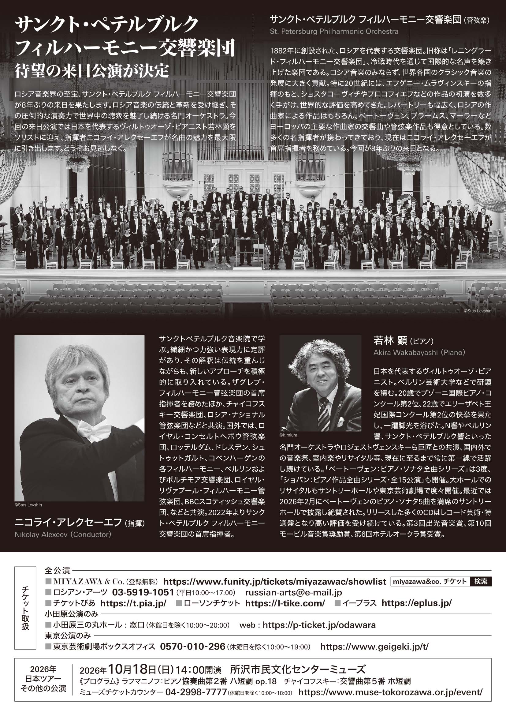 1882年に創設された、ロシアを代表する交響楽団。旧称は「レニングラード・フィルハーモニー交響楽団」、冷戦時代を通じて国際的な名声を築き上げた楽団である。ロシア音楽のみならず、世界各国のクラシック音楽の発展に大きく貢献。特に20世紀には、エフゲニー・ムラヴィンスキーの指揮のもと、ショスタコーヴィチやプロコフィエフなどの作品の初演を数多く手がけ、世界的な評価を高めてきた。レパートリーも幅広く、ロシアの作曲家による作品はもちろん、ベートーヴェン、ブラームス、マーラーなどヨーロッパの主要な作曲家の交響曲や管弦楽作品も得意としている。数多くの名指揮者が携わってきており、現在はニコライ・アレクセーエフが首席指揮者を務めている。今回が8年ぶりの来日となる。