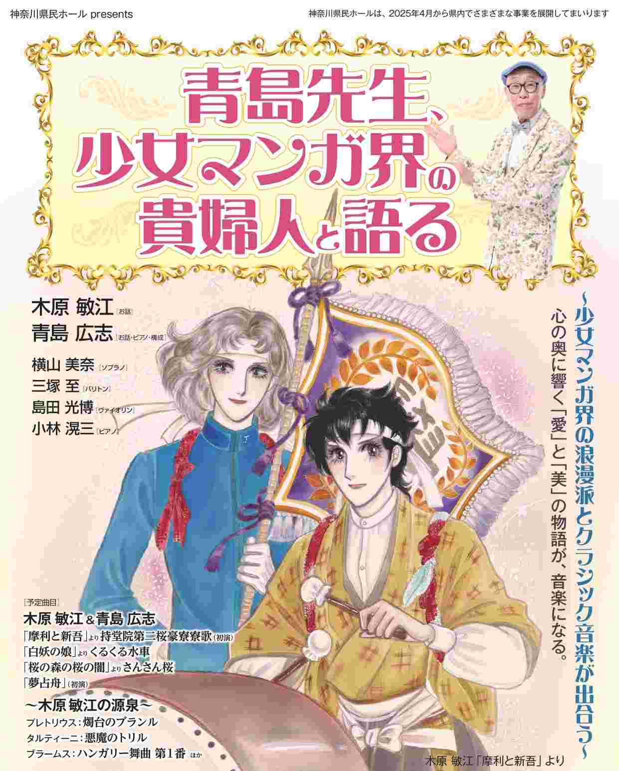 | ●神奈川県民ホール presents | 3月14日(土)15:00 | 小ホール | 木原 敏江(お話・マンガ家)、青島 広志(お話・ピアノ・構成)、横山 美奈(ソプラノ)、三塚 至(バリトン)、島田 光博(ヴァイオリン)、小林 滉三(ピアノ) |