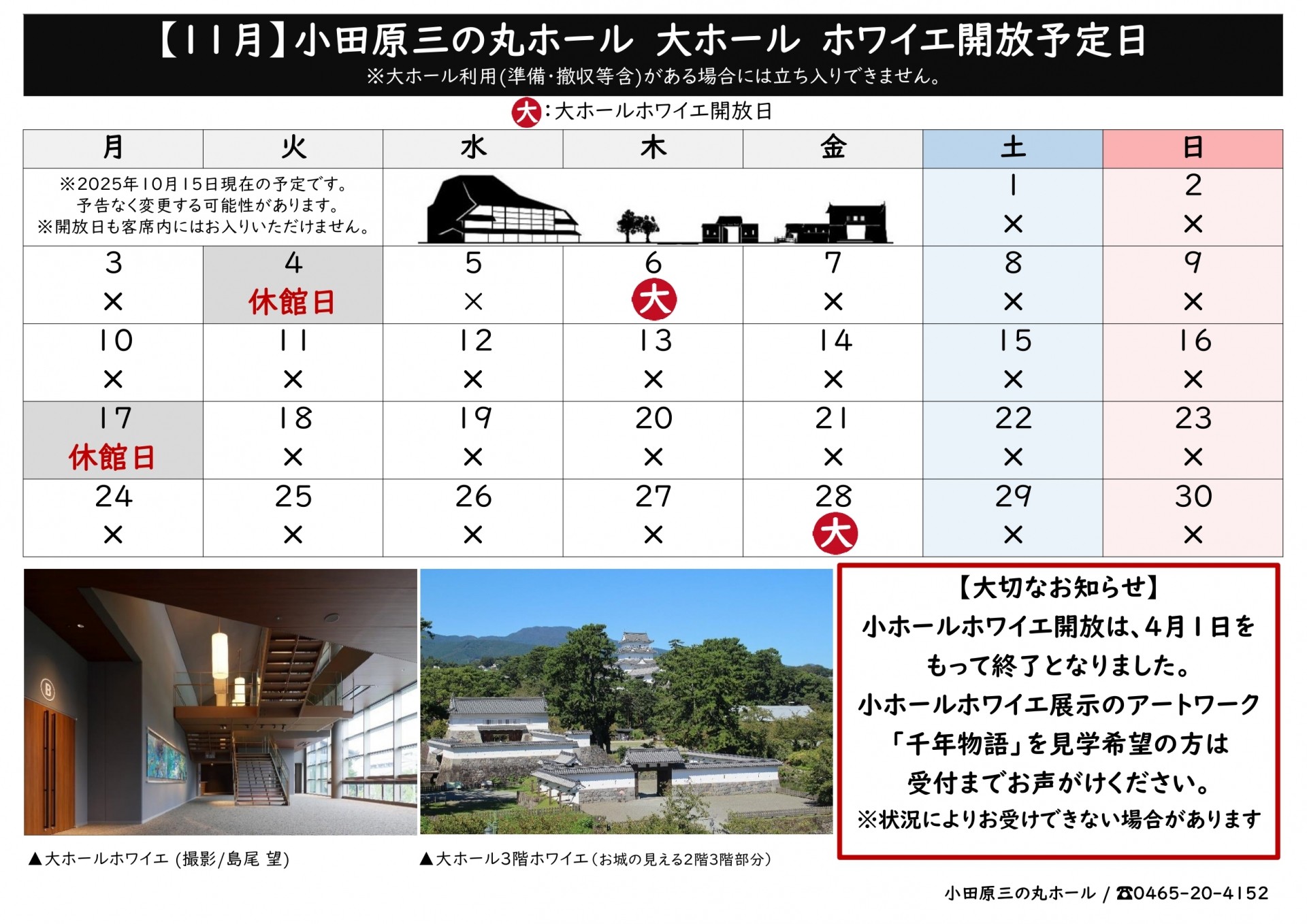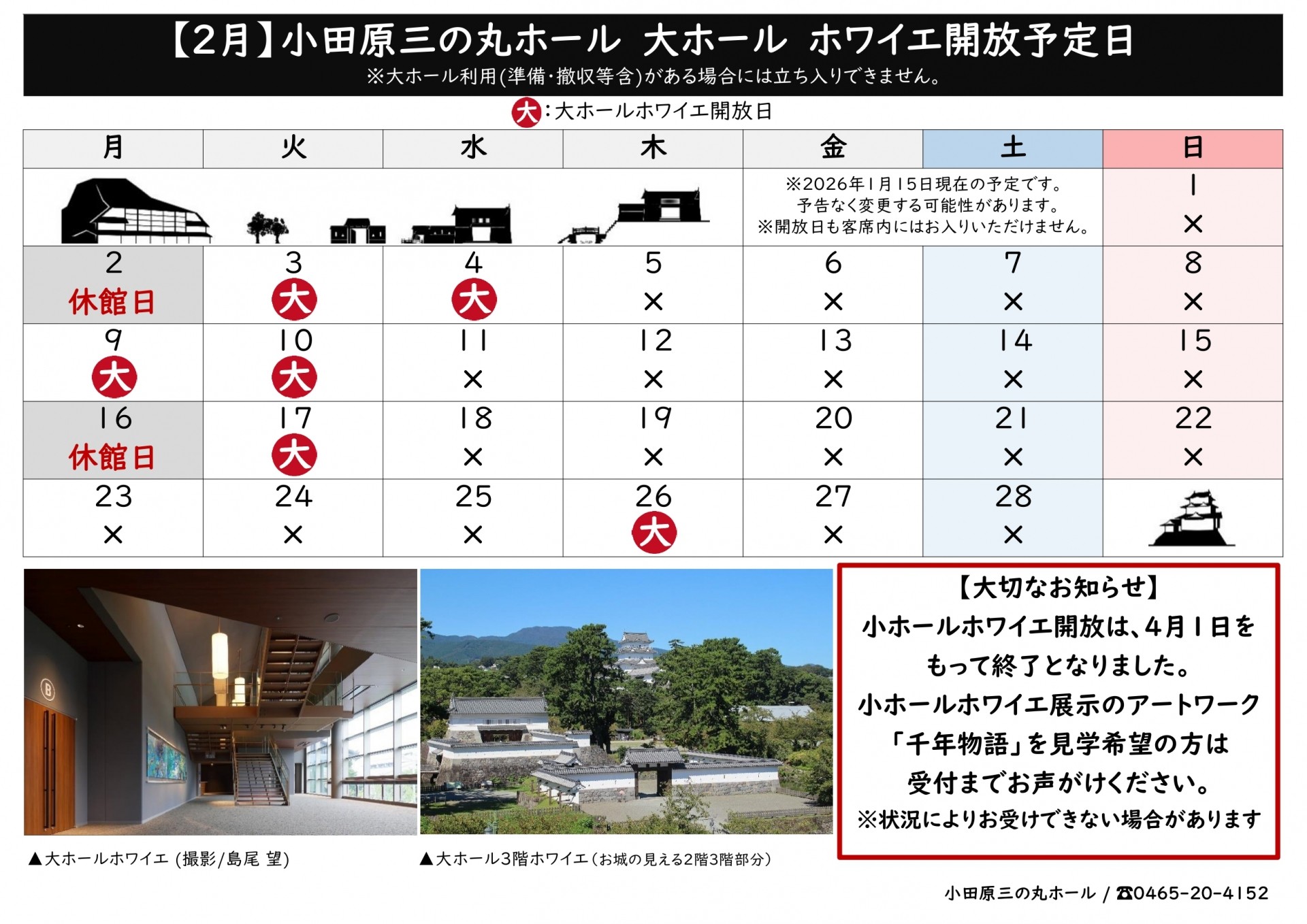 大ホールホワイエでは、2階と3階から小田原城を望むことができるほか、社会福祉法人アール・ド・ヴィーヴル制作作品(寄贈品)を見ることができます。